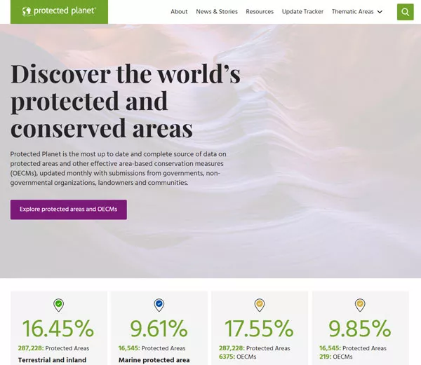Protected Planet is the most up to date and complete source of data on protected areas and other effective area-based conservation measures (OECMs), updated monthly with submissions from governments, non-governmental organizations, landowners and communities.